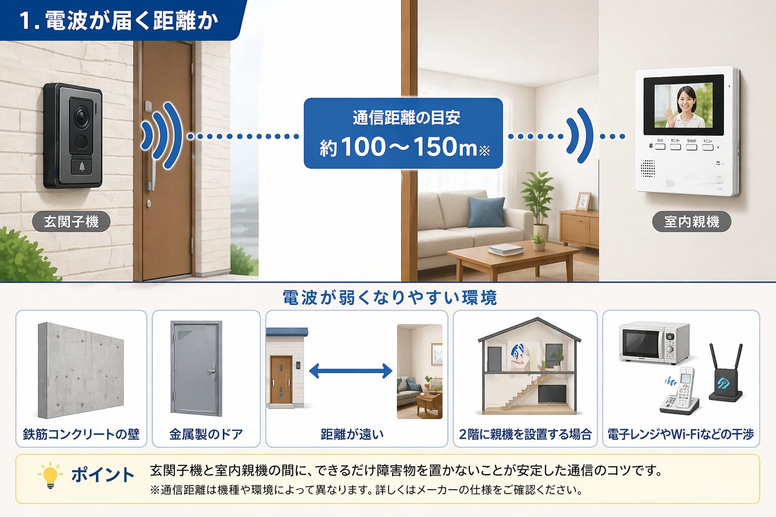 メーカー仕様には「見通し距離○m」などの目安が書かれていることがありますが、これは障害物が少ない環境での数値です。実際の住宅では、壁・ドア・階数・建材の影響を受けるため、表示されている距離より短く考えておく方が安全です。