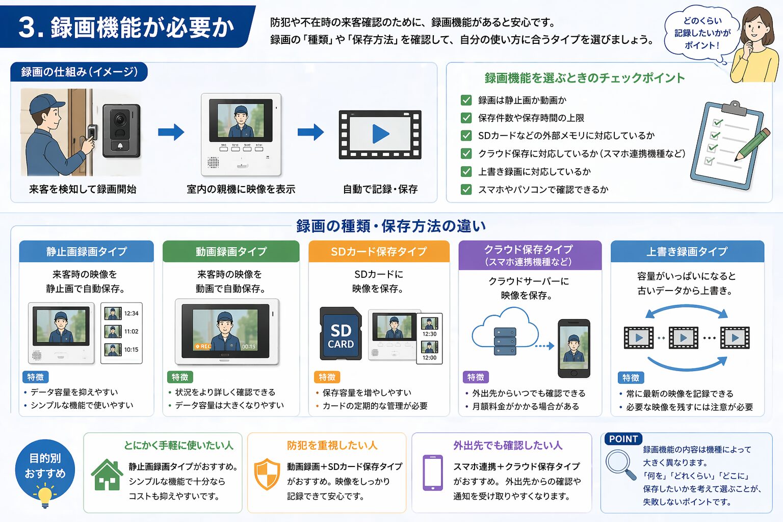 防犯目的で選ぶ場合は、「録画できるか」だけでなく、「何を」「どれくらい」「どこに保存できるか」まで確認するのが失敗しないポイントです。