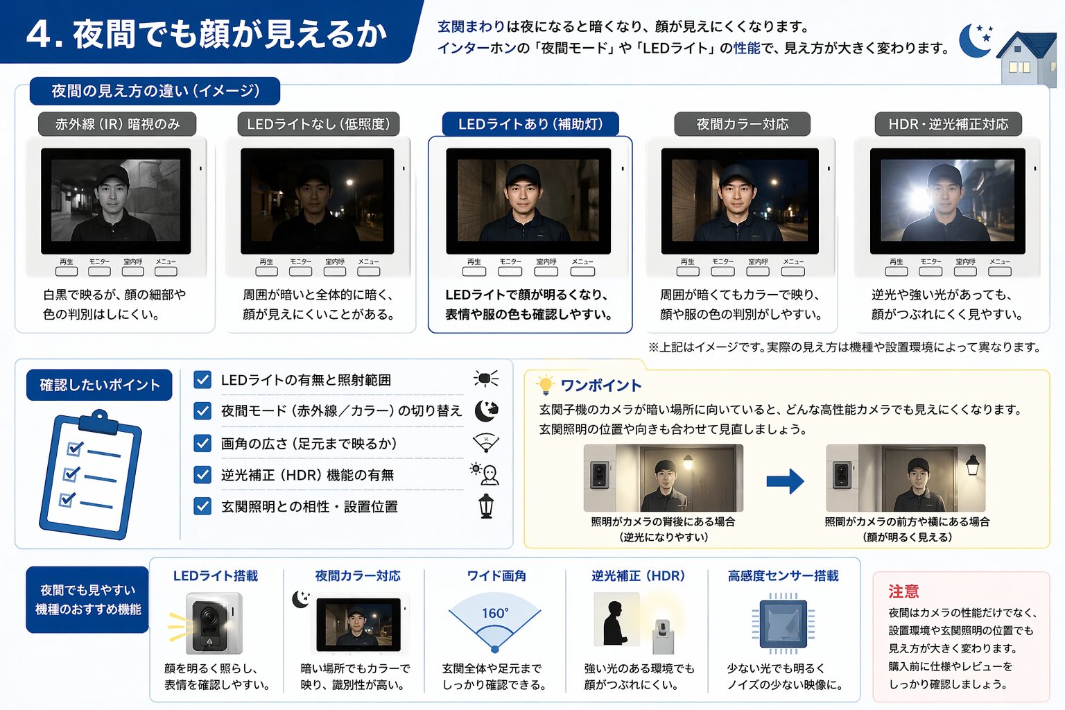 特に、防犯目的でインターホンを設置する場合は、夜間でも訪問者の顔や服装がある程度確認できるかが重要です。