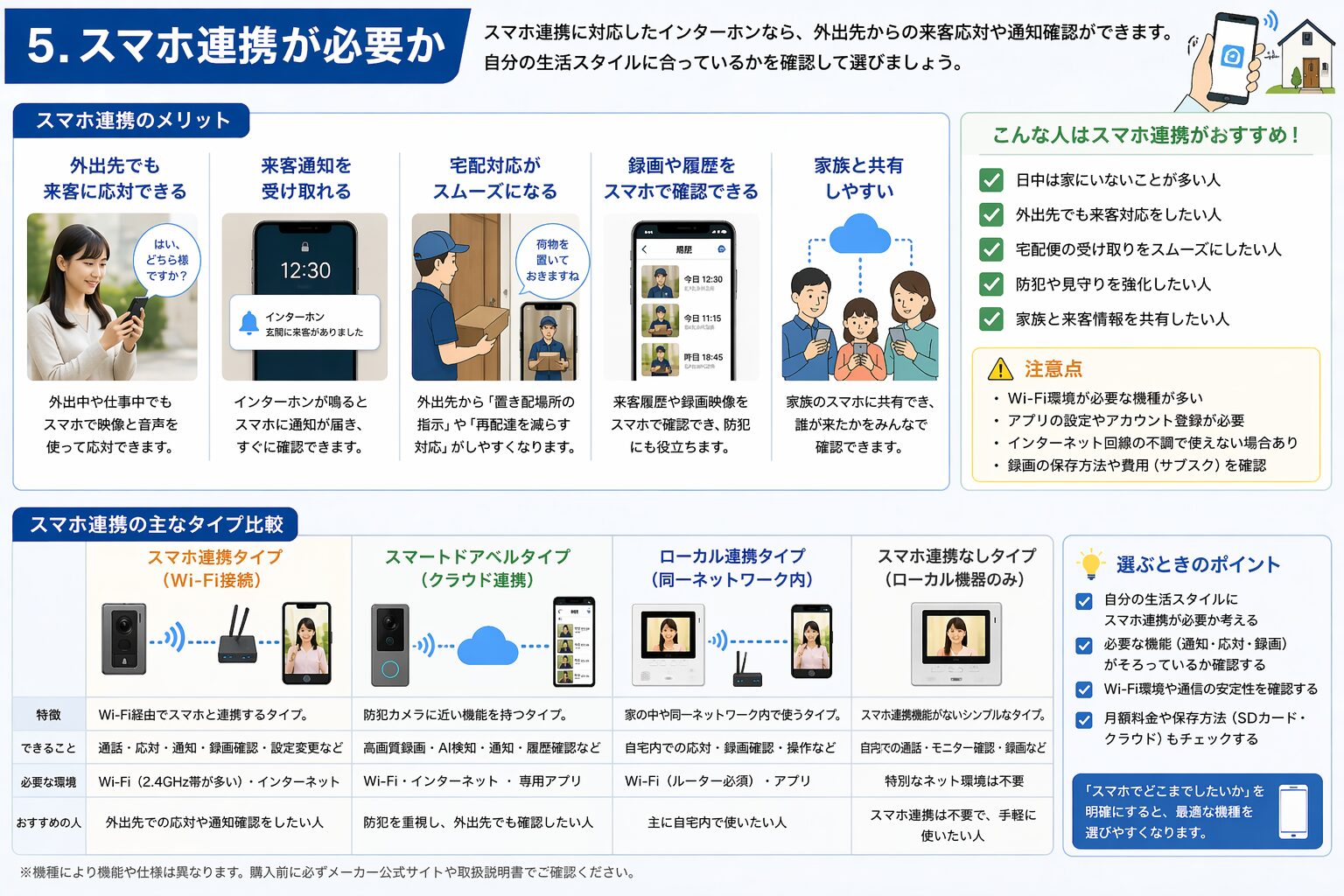 ただし、Wi-Fi環境や設置場所の条件、既存インターホンとの違いは事前に確認しておきましょう。