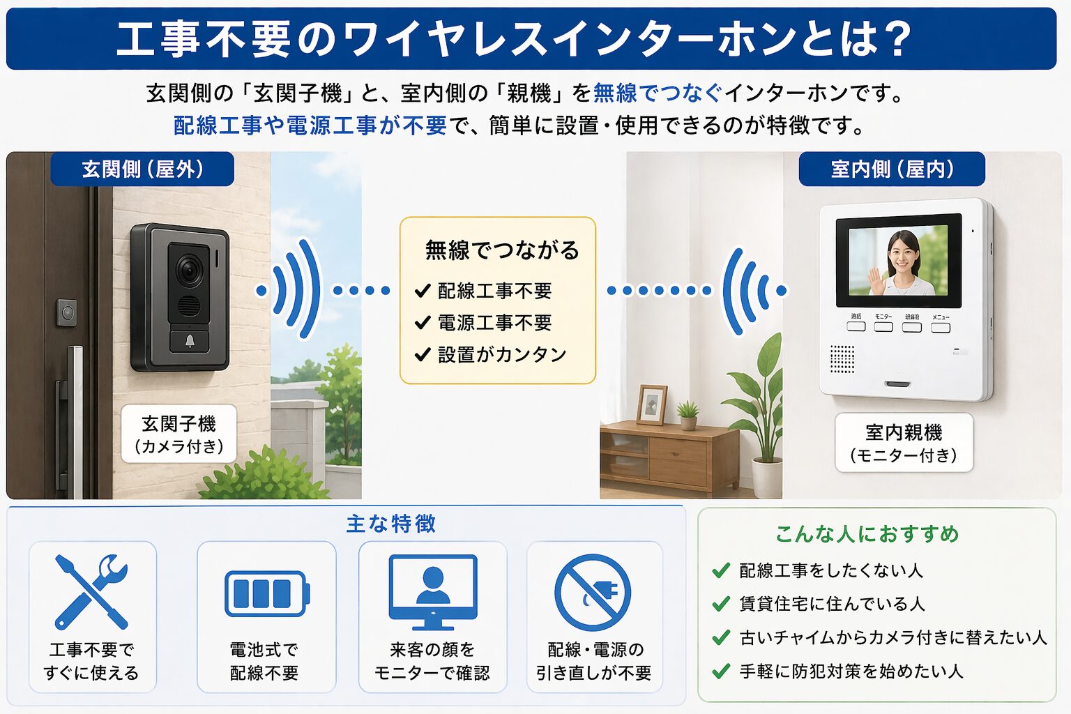 工事不要タイプは、親機と子機をワイヤレスでつなぐことで、配線工事なしで使いやすい機種です。ただし、取り付け方法や電源方式は機種によって違うため、購入前に確認してください。